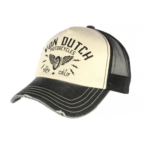 Casquette filet Von Dutch beige et noire Motorcyles L.A. Calif modèle Crew beige, casquette baseball homme et femme visière curve taguée d'une roue ailée look custom garage de Kenneth Howard.