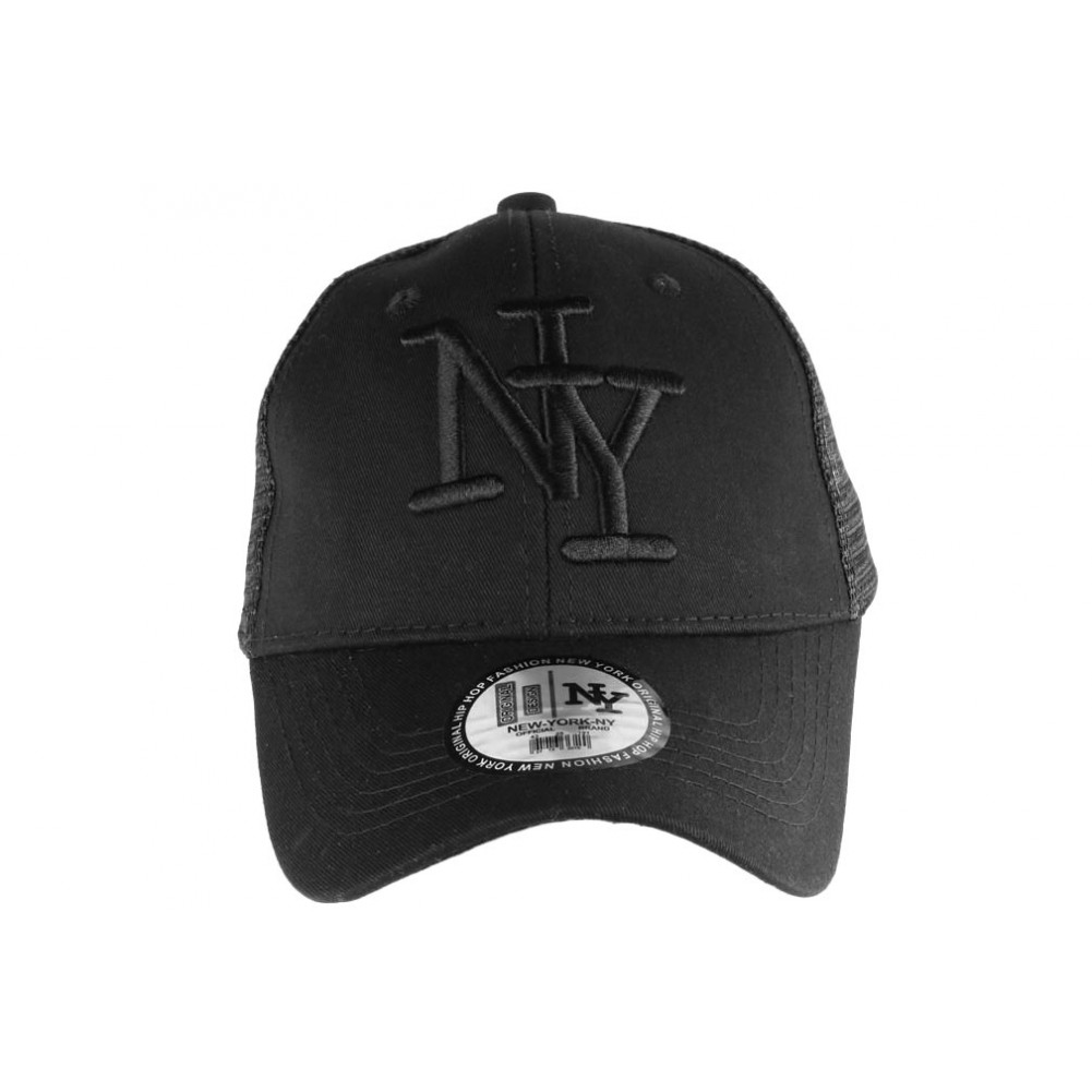 Casquette trucker NY noire référence Gybz Black sélection Hip Hop Honour, casquette filet homme et femme en toile noir au design sobre et fashion, autocollant NY Official Brand noir et gris sur la visière baseball
