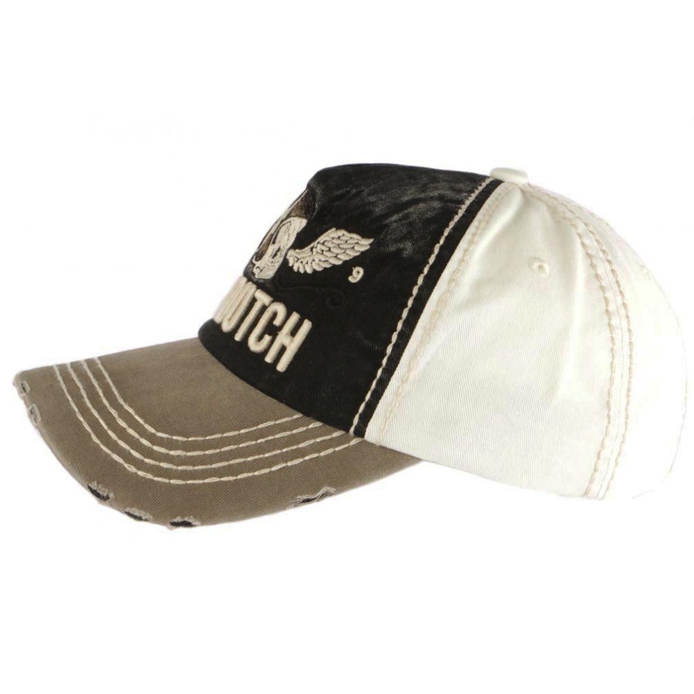 Esprit custom direct, cette belle casquette américaine Von Dutch noire modèle Xavier Black est d'une allure fashion à la fois vintage avec des coloris sobres et décalés façon fifties. La calotte de cette casquette baseball homme et femme est en toile de coton noire devant et blanc cassé sur l'arrière, le logo Von Dutch est brodé beige couture 3D apparaissant sous une tête de mort portant casque et des ailes d'aigle USA dans une esprit électrique avec un éclair, Kenneth Howard utilisa énormément ce symbole de la puissance de la nature L'arrière de la casquette curve retro montre la ceinture de réglage de taille en tissu avec sa boucle métallique frappée de la griffe Von Dutch. La visière baseball tendance avec ses grosses surpiqures beige est en coton vert kaki avec le bord élimé destroy pour un look vintage.