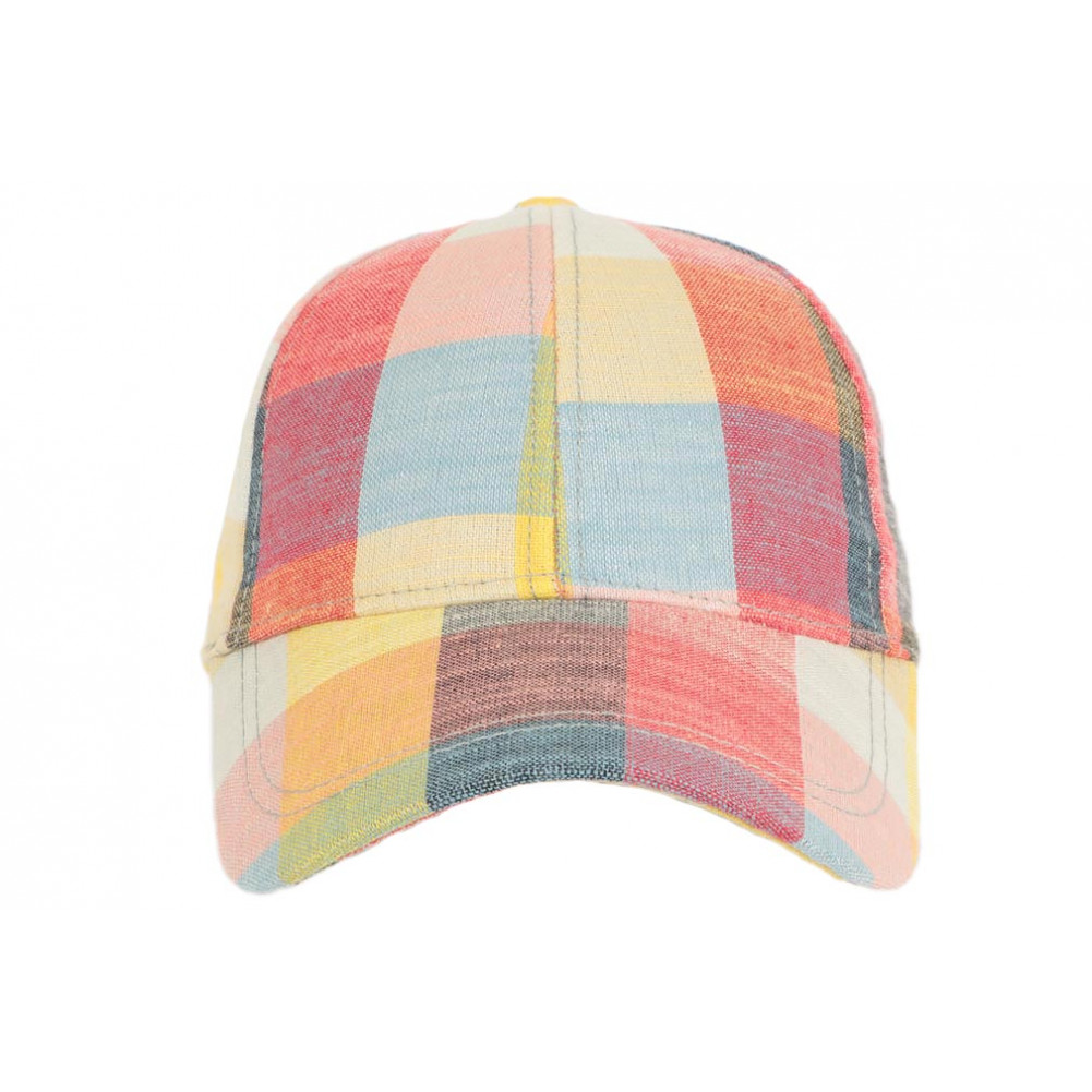 Trouvez une casquette baseball a carreaux oranges, jaunes et bleus look été original et rétro référence Sun Sulyk marque Léon Montane, casquette baseball homme et femme look vintage en toile de coton mixée légère et confortable, visière courbe fashion, taille réglable.