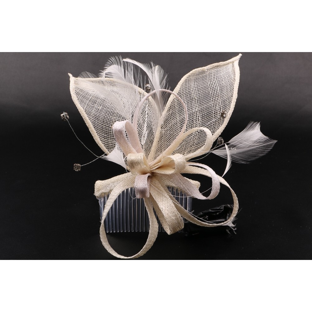 Cette coiffe de mariée de la marque Leonmontane de couleur écru est montée sur peigne, elle est garni de plumes.