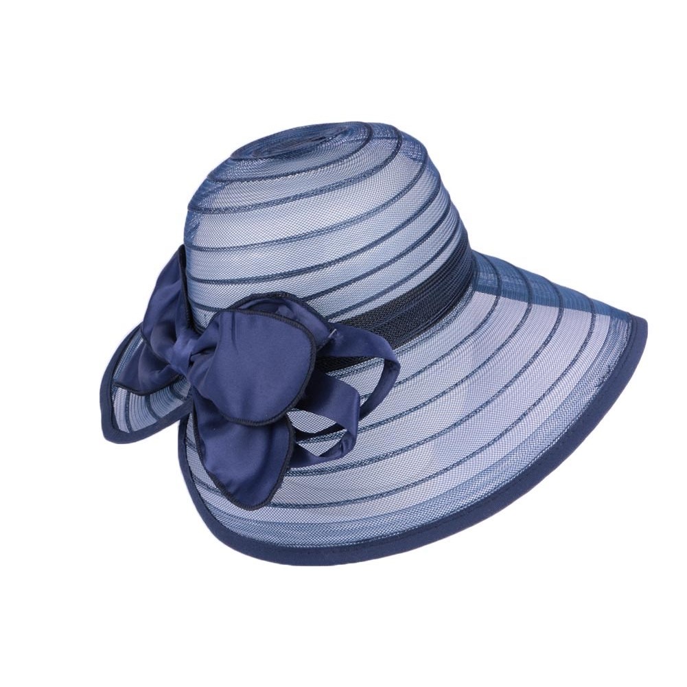 Chapeau de mariage bleu marine en crin tressé style aérien et léger réference Lyza sélection Léon Montane, capeline bleu pour cerémonie avec gris noeud marine en satin.