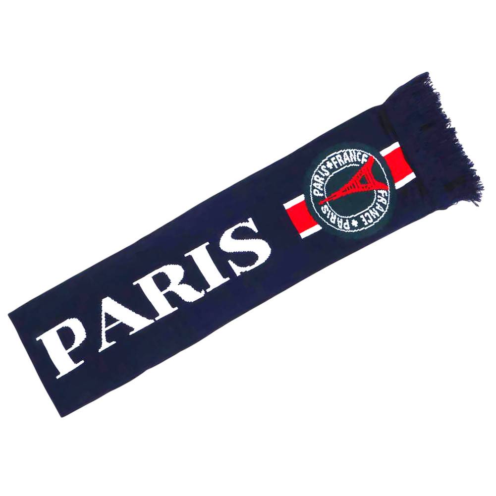 Cette écharpe arbore un design basé sur les couleurs traditionnelles du club : le Bleu Marine prédominant. Les mots "ALLEZ PARIS" et "PARIS" sont tricotés en lettres capitales blanches, bien visibles. Aux extrémités, l'emblème met en vedette la Tour Eiffel rouge, encerclée par les mots "PARIS • FRANCE", le tout intégré dans les bandes tricolores (Bleu, Blanc, Rouge) rappelant le drapeau national.