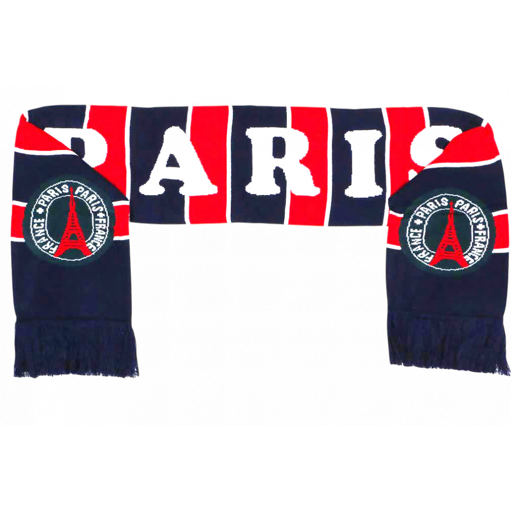 Le cœur de cette écharpe présente une succession de larges bandes verticales rouge et bleu marine, où le mot "PARIS"est tricoté en blanc, offrant un contraste maximal. Aux extrémités, un blason circulaire reprend l'emblème iconique de la Tour Eiffel rouge au centre, entouré des inscriptions "PARIS" et "FRANCE", ajoutant une touche d'authenticité et de patriotisme. Les franges bleu marine traditionnelles complètent l'ensemble.