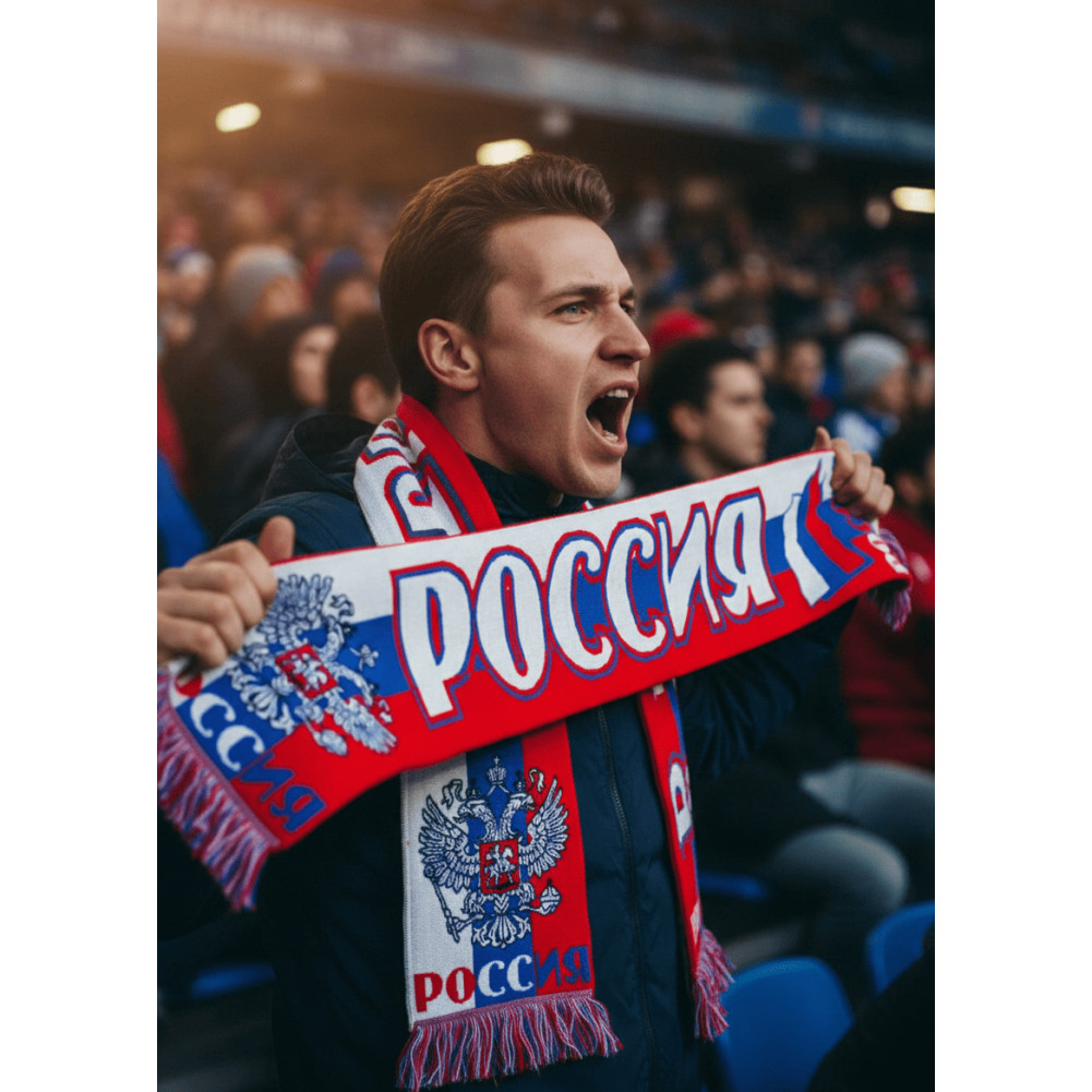 L'ACCESSOIRE INDISPENSABLE DU VÉRITABLE SUPPORTER Que ce soit pour suivre un match de football, de hockey sur glace ou tout autre événement international, cette écharpe de supporter russe est l'accessoire de ralliement par excellence. Elle présente un design double face arborant l'inscription "РОССИЯ" (Russie) en lettres capitales dynamiques, encadrée par les couleurs nationales : le blanc, le bleu et le rouge.
