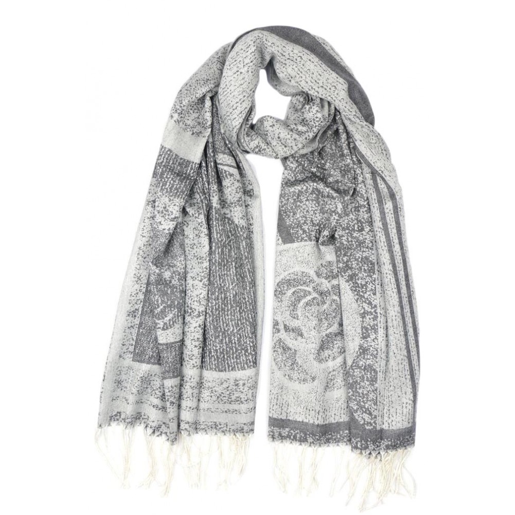 Acheter une grande echarpe pashmina femme et homme gris argent avec grandes fleurs de lotUs en laine pashmina mixée soie, grand foulard hiver pashmina pas cher allure chic référence Ladak Silver marque Léon Montane, Taille: 200cm long sur 70cm large.