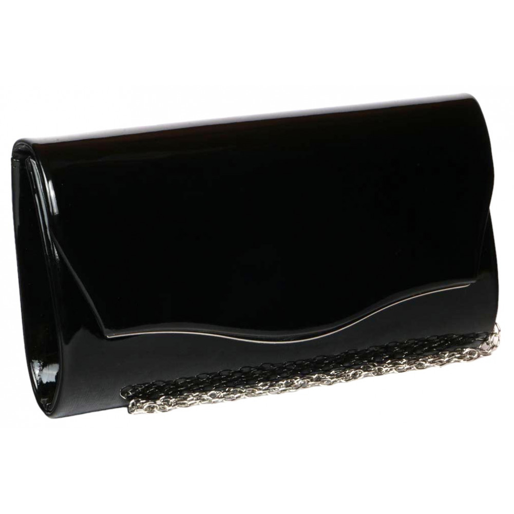 Vente pochette vernis noir en simili cuir brillant style classe et lumineux, pochette mariage noire pas cher marque Nyls Création référence Black Egla, sac de soirée vernis femme cérémonie avec chainette argent, taille de la minaudière noire 22cm*12cm*5cm pour ranger son smartphone, porte monnaie...