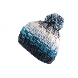 Bonnet à pompon Snow Dégradé de Bleu, Gris et Blanc, tricoté à la main, doublure en plush